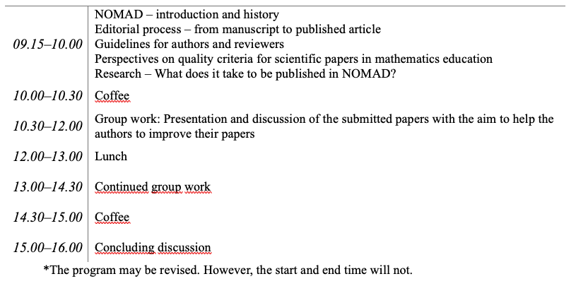 NOMAD - Nordic Studies in Mathematics Education, and the National Centre for Mathematics Education (NCM) at the University of Gothenburg arrange an annual one-day workshop on how to write an article for NOMAD, for doctoral students and newly graduated researchers from the Nordic and Baltic countries.