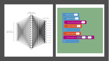 Scenen afføder en drøftelse af filmens etiske potentiale i mødet mellem menneske og maskine. De studerende drøfter indgående, på hvilket niveau det er nødvendigt at forstå robotten som kulturprodukt og forstå robotten som produkt af matematiske beregninger bag maskinlæring. Underviserne viser modellen (figur 3) for at støtte de studerende i at forstå forskellen mellem et traditionelt it-system og en sprogmodel, hvor datapunkter interagerer, og hvordan systemet er ”black-boxet”, fordi det reelt ikke kan beskrives, hvordan maskinlæring fungerer. Han peger på modellen om neurale netværk og dét punkt, hvor maskiner lærer maskiner og siger: