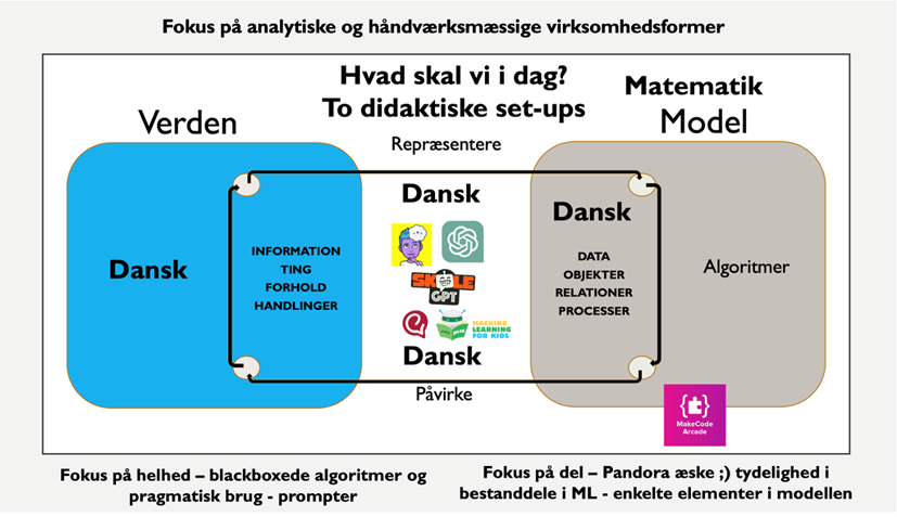 “I matematik står vi midt i den matematiske model og arbejder med delene for at skabe forståelse for maskinlæring, i dansk ser vi på en færdig model, og det er kun gennem brugen, vi ser, hvad den kan, og kan afsløre den, i matematik arbejder vi med modellen, i dansk arbejder vi med brugen af modellen. Vi kan sætte en algoritme op, men vi kan ikke gennemskue det algoritmisk, vi kan ikke kortlægge, hvad der sker i maskinen (…)”