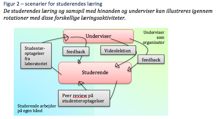 Artiklen beskriver, hvorledes vi med udgangspunkt i de studerendes læringssituation designer inddragelse af video i undervisning og feedback. Videomediet skal bruges direkte i og som forberedelse til undervisningen samt til hjemmeopgaver. Formidling af optagelserne skal kunne ske både mellem underviser og studerende og mellem studerende indbyrdes. Videooptagelserne gøres til genstand for direkte feedback til studerende. De er også udgangspunkt for peer feedback mellem studerende både i og udenfor den planlagte undervisning.