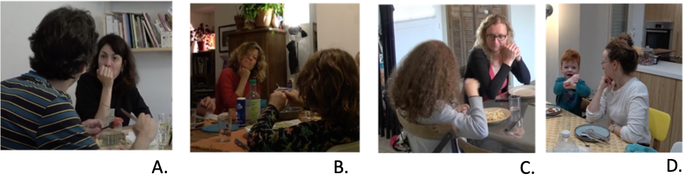 Besides co-activity, we also find instances of doing attending (only) characterized by a still posture, with the head resting on the fist, an occasional head tilt, and gaze fixated on the main speaker. These visible displays are illustrated in the series of screenshots below, in Figure 1. In these examples, most of the mothers are done eating, so they are no longer coordinating between different activities, but rather focusing their full attention on their interlocutor. The first two illustrations on the left (A and B) are taken from French speaking families, and the next ones (C and D) from French Sign Language.