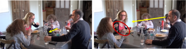 As Mondada et al. (2021:4) wrote: "sensory practices can be mobilized and made relevant at any point and in a fleeting way". Family dinners revolve around sensory practices (tasting and smelling the food, serving a glass of water, grabbing the salt from across the table etc.) which may not seem to be directly related to the interaction at first, but which, in some cases, play an integral part in the interaction. The final example, taken from another French Signing family, demonstrates the importance of visual space, and how participants may wish to adjust their spatial environment for visual attention. Here the father is about to engage with his daughter on his left (Figure 8) but he first slightly moves the bottle to the side before yielding her the turn.